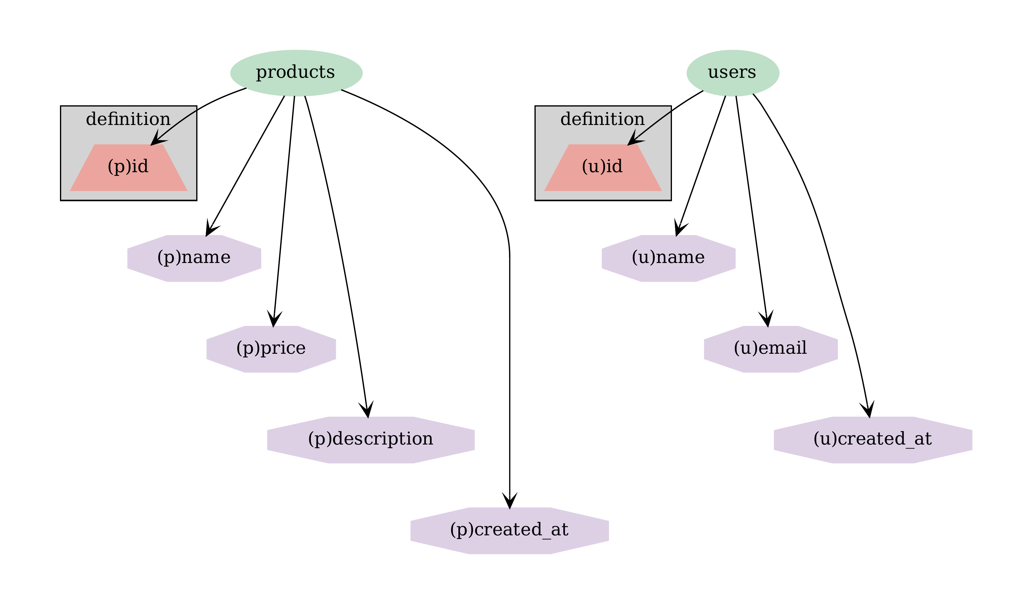 users,products(with typed fields matching PostgreSQL columns) - Edges: