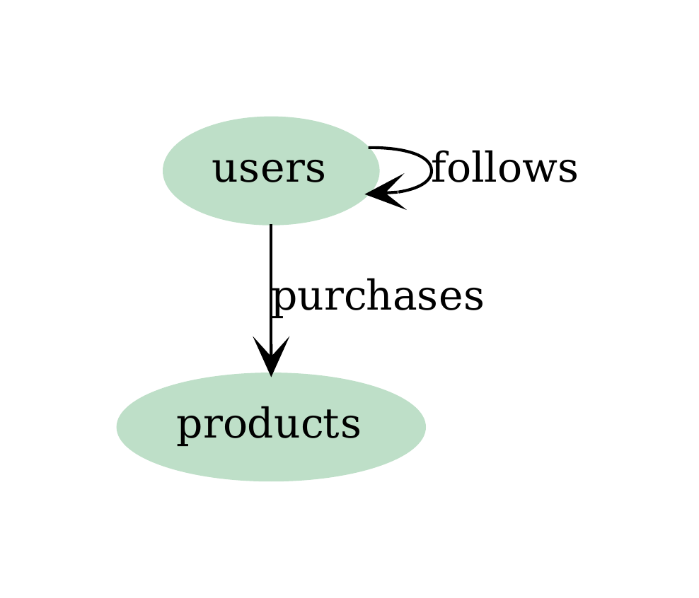 users → productsrelationship (purchases)users → usersself-referential relationship (follows)